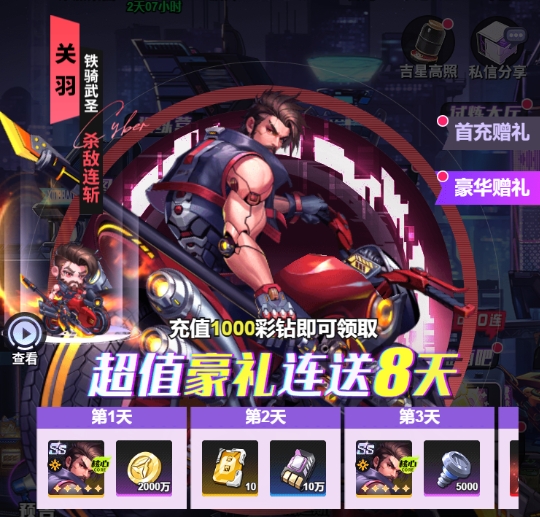 2、前8天累充满100元可以额外解锁首充的3个ss核心关羽本体+50抽;