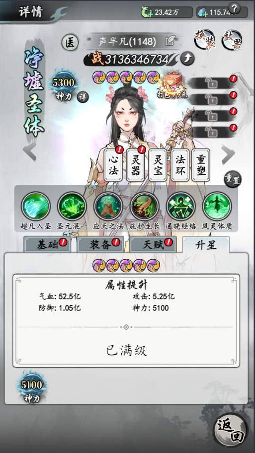 资质系统,这里的资质除了常规的天命外还包含了灵药系统和天赋系统,游戏内的资质是可以进行洗练的,除此之外还可以通过吞噬灵丹或者天才地宝来为主角提升永久的属性。游戏内的天赋会顺着主角的进阶慢慢的提升,其中的过程就相当于修仙小说中的修真废材通过一步步的考验变为上古奇才一样。除此之外游戏内的境界同样也是对照修仙小说一比一还原的,战力也会随着境界的提升慢慢的增加,所以前期想要提升战力突破境界是必不可少的。